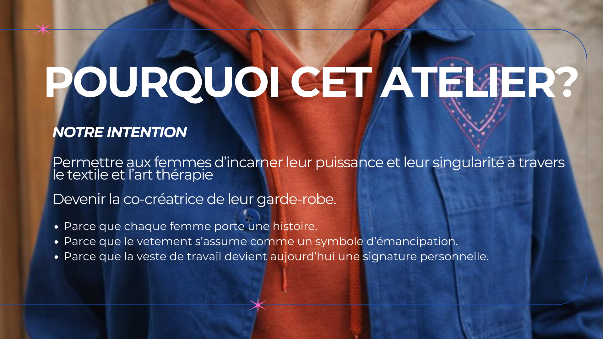 MA VESTE MON EMPREINTE est la façon de créer une pièce unique de tes propres mains. Elle devient un rituel de passage pour celles qui sont en transition et qui veulent incarner leur puissance.