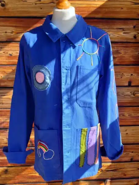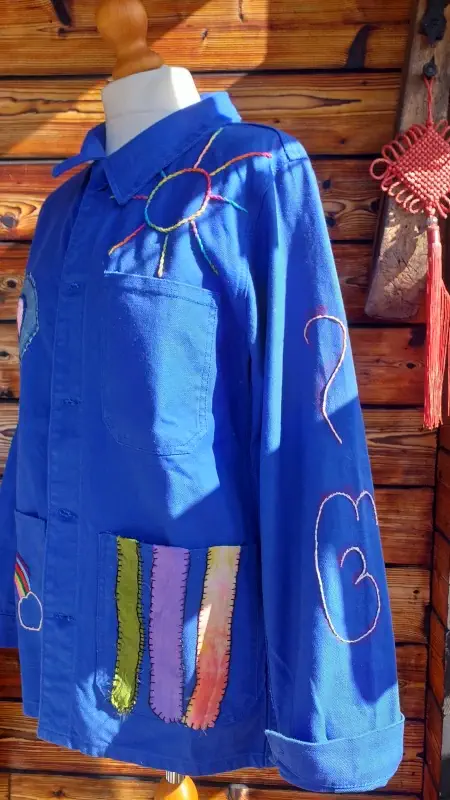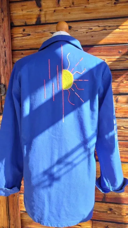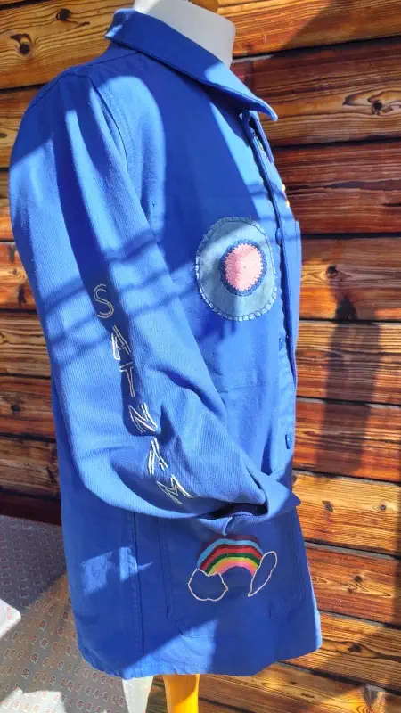 La veste est initialement lavée et rincée 2 fois pour rendu plus patiné, les broderies sont faites à la main au nombre de 3 : une au dos, une devant, une sur une des 2 manche. Rajout d’une série de rubans de soie bénies et d’un patch avec crochet MadeinFrede.